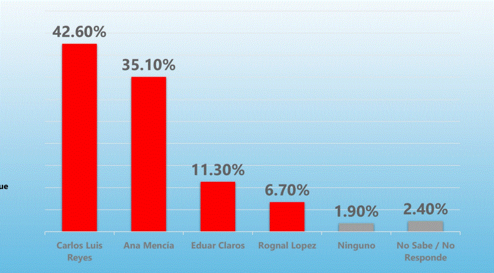 En la contienda por la candidatura liberal, Carlos Luis Reyes encabeza la preferencia con un 42.60% de apoyo, seguido por Ana Mencía con 35.10%. En tercer lugar se encuentra Eduar Claros con un 11.30%, mientras que Rognal López obtiene un 6.70%. Un 1.90% de los encuestados indicó que no votaría por ninguno, y un 2.40% no respondió.