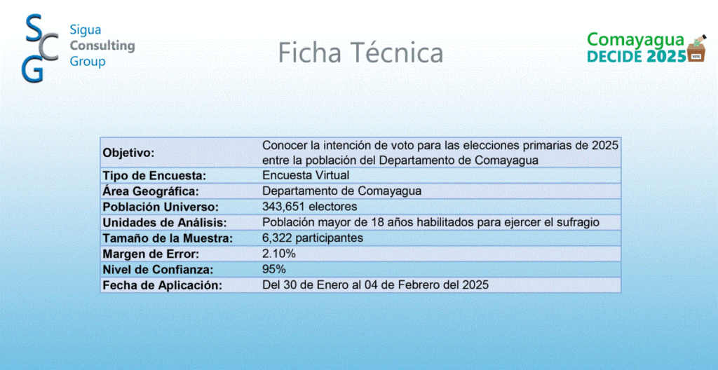 El estudio, llevado a cabo entre el 30 de enero y el 4 de febrero de 2025, tuvo una muestra de 6,322 personas, con un margen de error del 2.10% y un nivel de confianza del 95%. Su objetivo fue medir la intención de voto para las elecciones primarias del 2025 en el departamento de Comayagua.