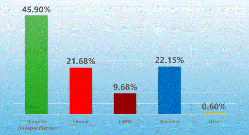 Cuando se consultó sobre la identificación política, el 45.90% de los encuestados manifestó no identificarse con ningún partido. El 21.68% se inclinó por el Partido Liberal, el 22.15% por el Partido Nacional y el 9.68% por Libertad y Refundación (Libre).