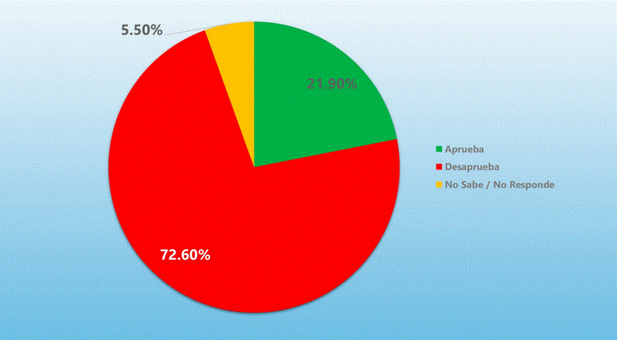La encuesta también evaluó la aprobación de la presidenta Xiomara Castro, con un resultado del 72.60% de desaprobación y un 21.90% de aprobación. Un 5.50% no respondió. Asimismo, el Congreso Nacional obtuvo un 74.00% de desaprobación y un 16.20% de aprobación.