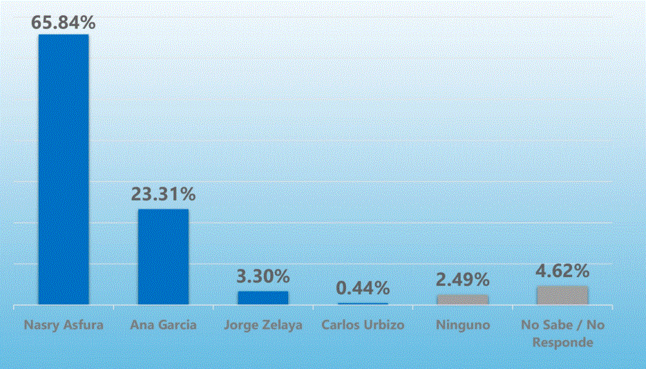 Por su parte, en el Partido Nacional, Nasry Asfura encabeza las preferencias con un 65.84%, seguido por Ana García con un 23.31%. Jorge Zelaya obtiene un 3.30% y Carlos Urbizo un 0.44%. Un 2.49% indicó que no votaría por ninguno y un 4.62% no respondió.