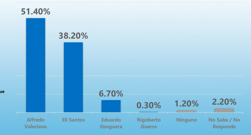 Por el lado del Partido Nacional, Alfredo Valeriano se perfila como el favorito con un 51.40% de respaldo. Su más cercano competidor, Elí Santos, alcanza un 38.20%. Eduardo Oseguera obtiene un 6.70%, Rigoberto Guerra un 0.30%, mientras que el 1.20% no votaría por ninguno y el 2.20% no respondió.